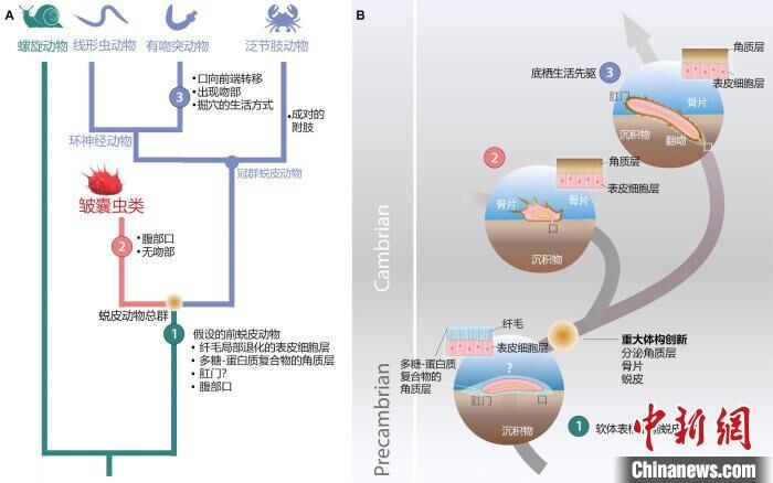 中新网西安7月9日电 (记者 阿琳娜)记者9日从西北大学获悉,中法团队联合研究揭示了中国寒武纪早期皱囊虫和贝雷虫共同构成蜕皮动物一个新的高级分类单元——皱囊动物门,并且否定了皱囊动物是由具有终端口的蠕虫状环神经动物简化而来的观点。