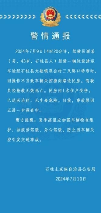 中新网7月10日电 据重庆石柱土家族自治县公安局微信公众号消息,石柱土家族自治县公安局10日发布警情通报称,7月9日14时20分许,驾驶员谢某(男,43岁,石柱县人)驾驶一辆垃圾清运车途经石柱县大歇镇双会村三叉路口转弯时,因操作不当致车辆失控撞向路边民房。驾驶员经抢救无效死亡。民房内1名住户受伤,已送医治疗,无生命危险。目前,事故原因正进一步调查中。
