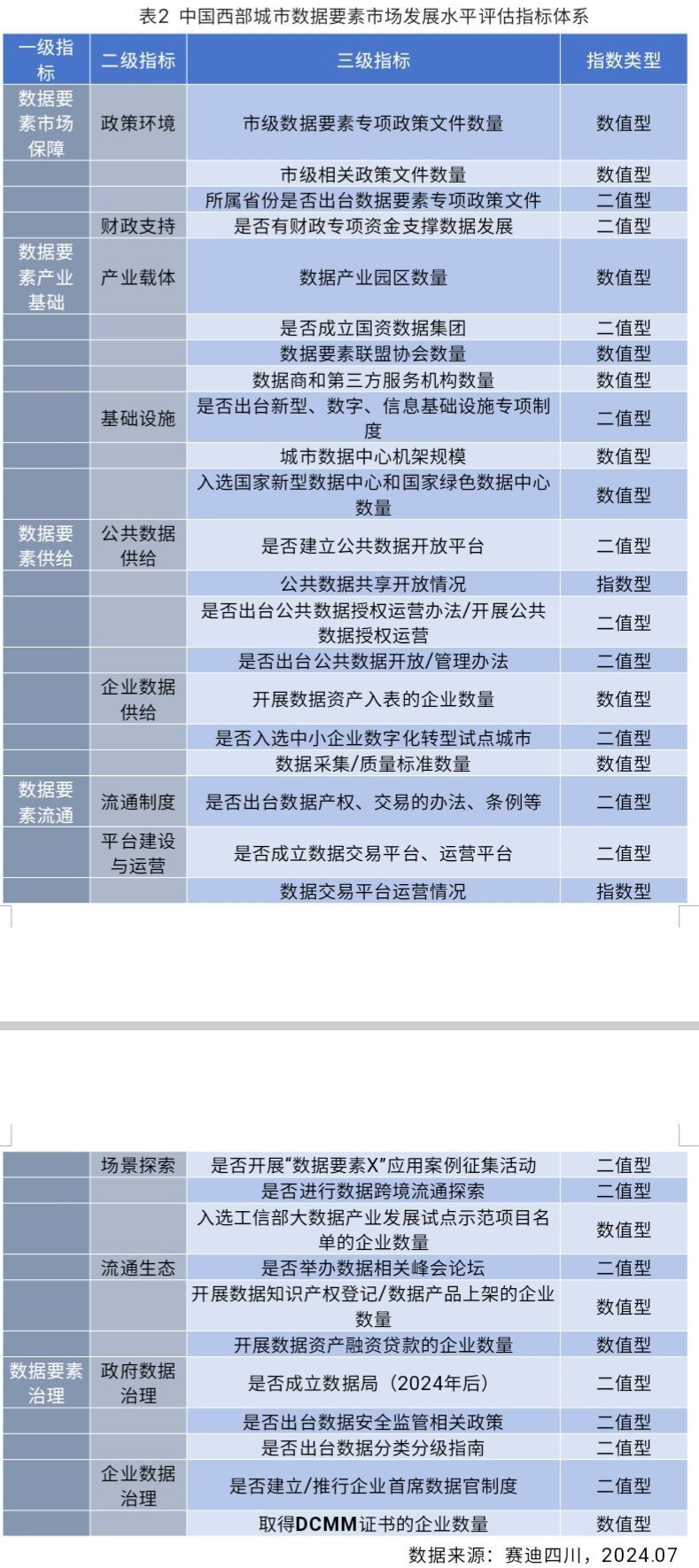 《中国西部城市数据要素市场发展水平评估报告(2024年)》在2023年中国城市数据要素市场发展评估指标体系基础上,对指标进行了修改和补充完善,增加了是否成立国资数据集团、开展数据资产入表的企业数量、数据采集/质量标准数量、是否成立数据局(2024年后)等指标。