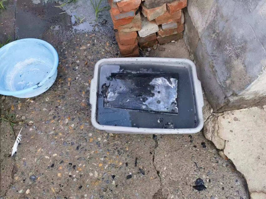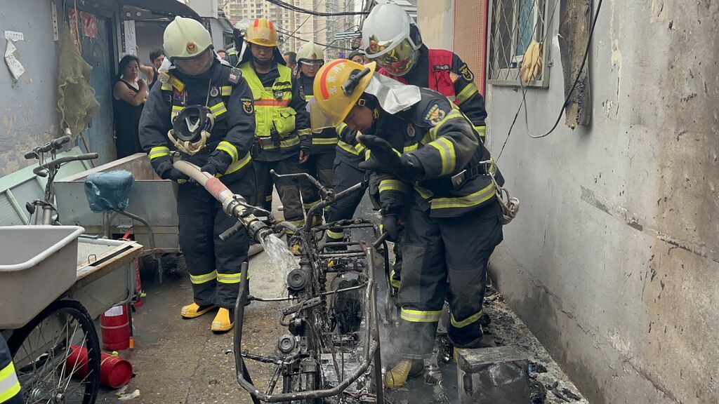 三家店消防救援站的队员到场后扑灭明火,但观察到电动自行车脚踏板下方的电池仍有冒烟迹象,为防止复燃,消防救援人员用水枪对准冒烟部位打水降温,接着拆卸电池,随后将其放入盛满水的容器里继续浸泡冷却。