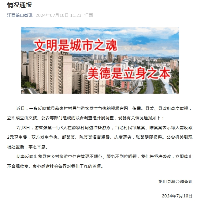 ·游客称在河边游玩遭村民收费,江西铅山:立即停止不合规收费。