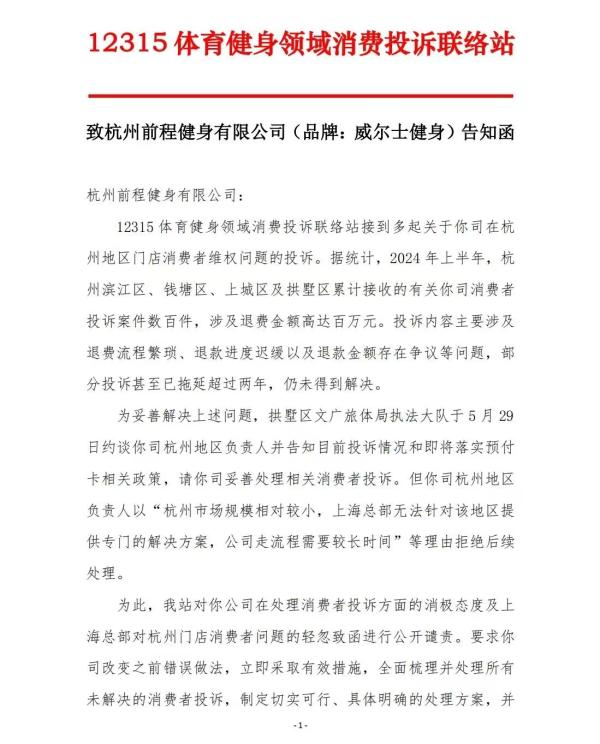 ·被指消极处理消费者投诉,杭州12315维权联络站公开谴责威尔士健身。