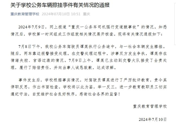 ·重庆教育管理学校通报公务车擦挂事件:已责令驾驶员停职反思。