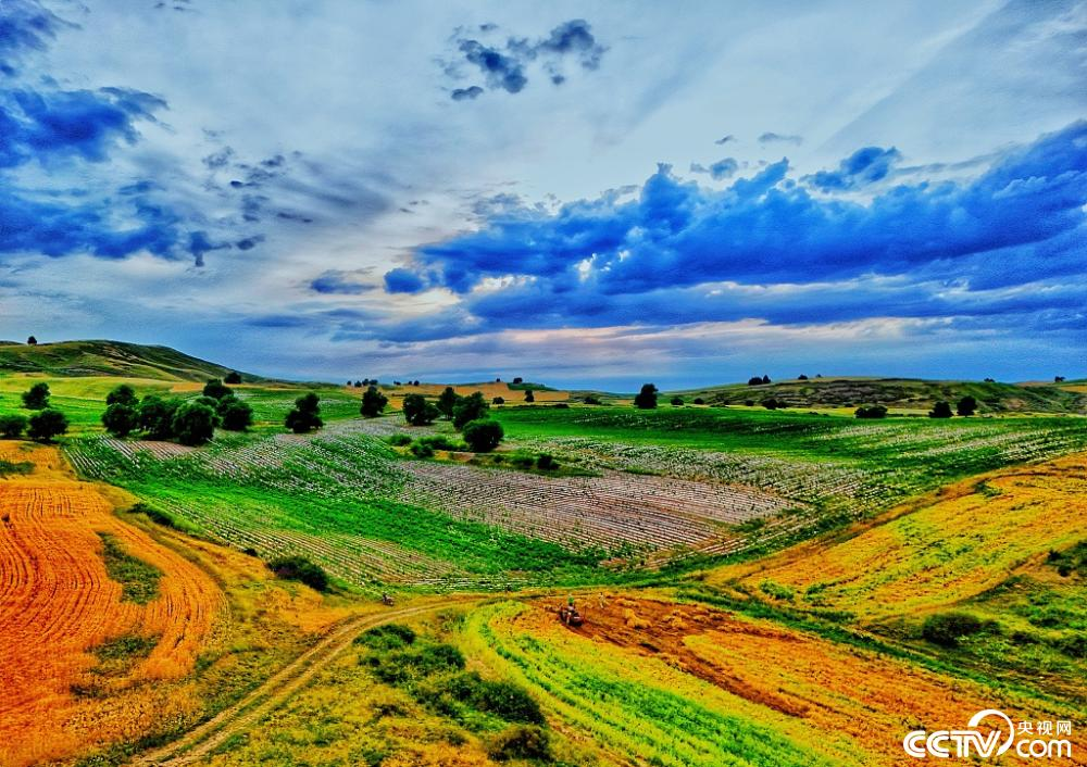 新疆昌吉回族自治州,木垒哈萨克自治县照壁山乡南闸村上空俯瞰可见万亩旱田。这里金色的麦田与绿色的鹰嘴豆地黄绿相间、错落有致,仿佛是大自然精心调制的调色盘。这一独特景观,展现了乡村夏日的迷人风光,吸引众多目光,成为夏日里一道亮丽的风景线。
