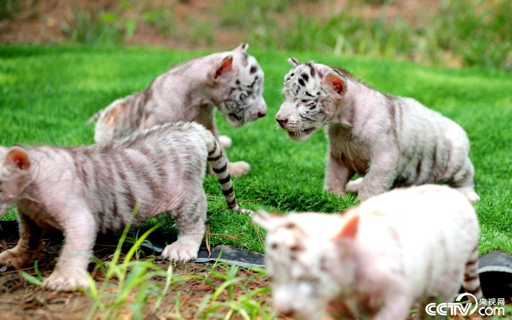 山东省东营市黄河三角洲动物园,虎娃在草地上嬉闹。据悉,6月5日,该园成功繁育出五只国家一级保护动物“白虎”,体征平稳,茁壮成长。