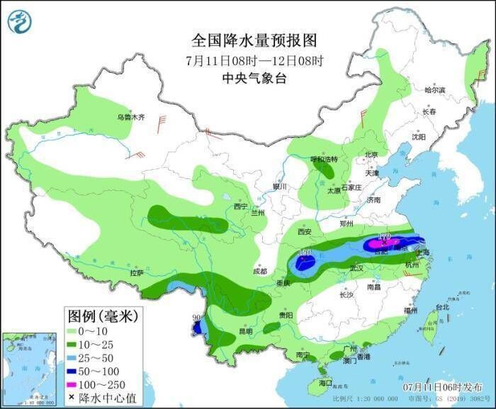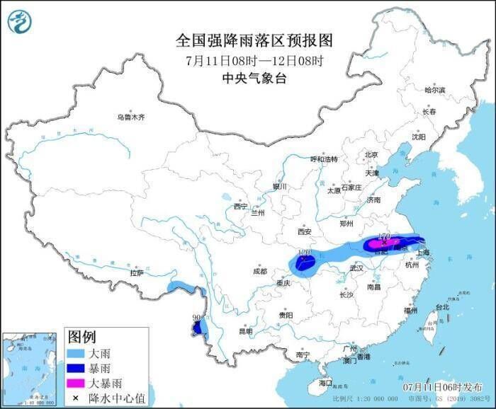 7月11日08时至12日08时,四川东北部、重庆中北部、湖北西部和北部、河南东南部、安徽中部、江苏南部、上海以及西藏东南部、云南西部等地部分地区有大到暴雨,其中,安徽中部、江苏西南部、重庆北部等地部分地区有大暴雨(100~170毫米)。内蒙古东南部和西北部、黑龙江东部、新疆东部、浙江中北部等地部分地区有4~6级风,其中,新疆东部部分地区有6~7级风。