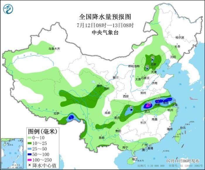 7月12日08时至13日08时,青藏高原东部、云南北部、华北东部、江汉、江淮、江南北部、重庆中东部等地部分地区有中到大雨,其中,西藏东南部、河南东南部、安徽中部、江苏南部、湖北东北部和西南部等地部分地区有暴雨或大暴雨(100~140毫米)。