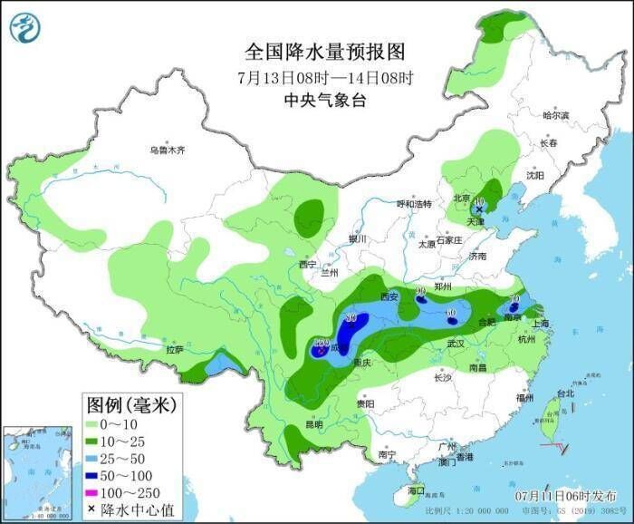 7月13日08时至14日08时,内蒙古西部、河北东北部、天津、西北地区东南部、黄淮西南部、江淮、江汉、江南北部、四川大部、重庆大部、云南南部和东北部等地部分地区有中到大雨,其中,四川中东部、河南西南部、江苏西南部、湖北东北部等地部分地区有暴雨或大暴雨(100~150毫米)。