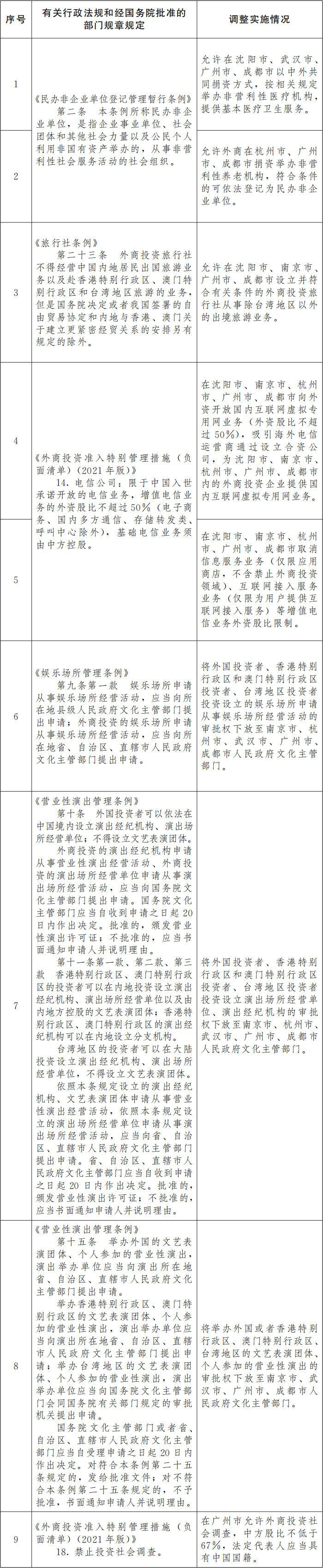 一、按照《国务院关于同意在沈阳等6个城市开展服务业扩大开放综合试点的批复》(国函〔2022〕135号),同意自即日起,在沈阳市、南京市、杭州市、武汉市、广州市、成都市等6个服务业扩大开放综合试点城市暂时调整实施《民办非企业单位登记管理暂行条例》、《旅行社条例》、《娱乐场所管理条例》、《营业性演出管理条例》、《外商投资准入特别管理措施(负面清单)(2021年版)》的有关规定(目录附后)。