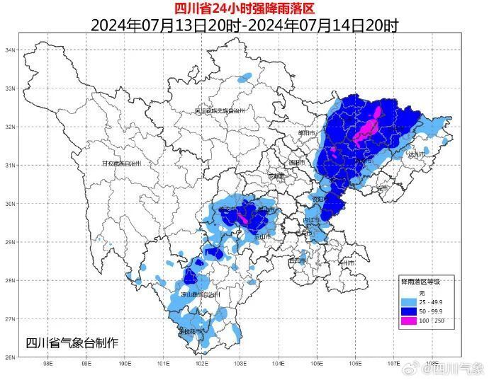 7月13日20时到14日20时:广元、巴中、南充、遂宁4市及资阳、绵阳2市东部,雅安南部、眉山西部、乐山北部有暴雨(雨量50~80毫米),局地有大暴雨(130-150毫米),最大小时雨量50~70毫米,另凉山州西部和攀枝花的部分地方有大雨到暴雨(雨量25~60毫米)。