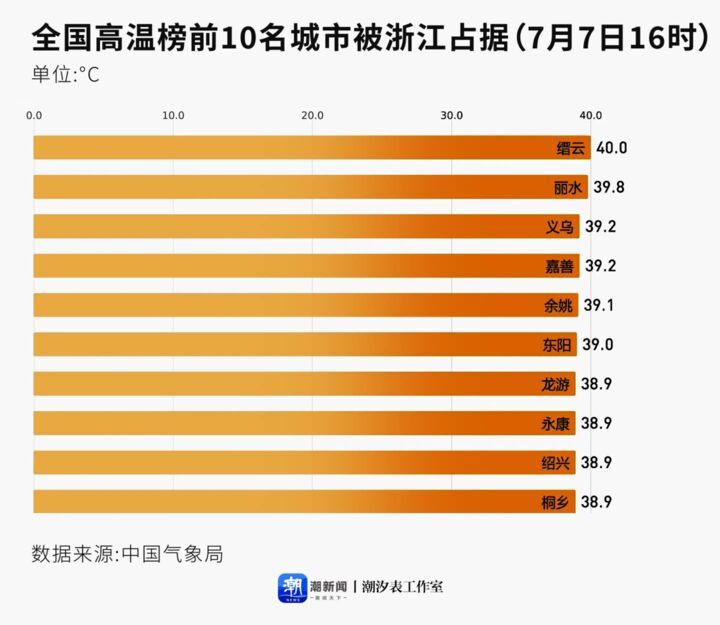 7月7日16时,浙江还未入伏便霸屏“热”榜,全国气温前十全部来自浙江。义乌、东阳、柯桥甚至连续57个小时最高气温都在30℃以上。