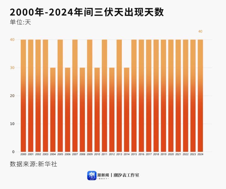 三伏天有30天“普通版”和40天“加长版”。本世纪至今以来,仅有2004、2006、2008、2010、2012和2014这6个年份的“三伏”是30天,其他18个年份的“三伏”都是40天,其中,2015年至2024年,更是连续10年的“三伏”都是40天。