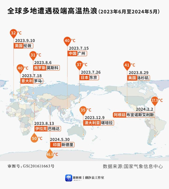 印度新德里气温达到52.3℃刷新高温纪录、中东多地遭遇51℃极端高温致550余人遇难;热浪席卷美国1.46亿人受高温威胁……