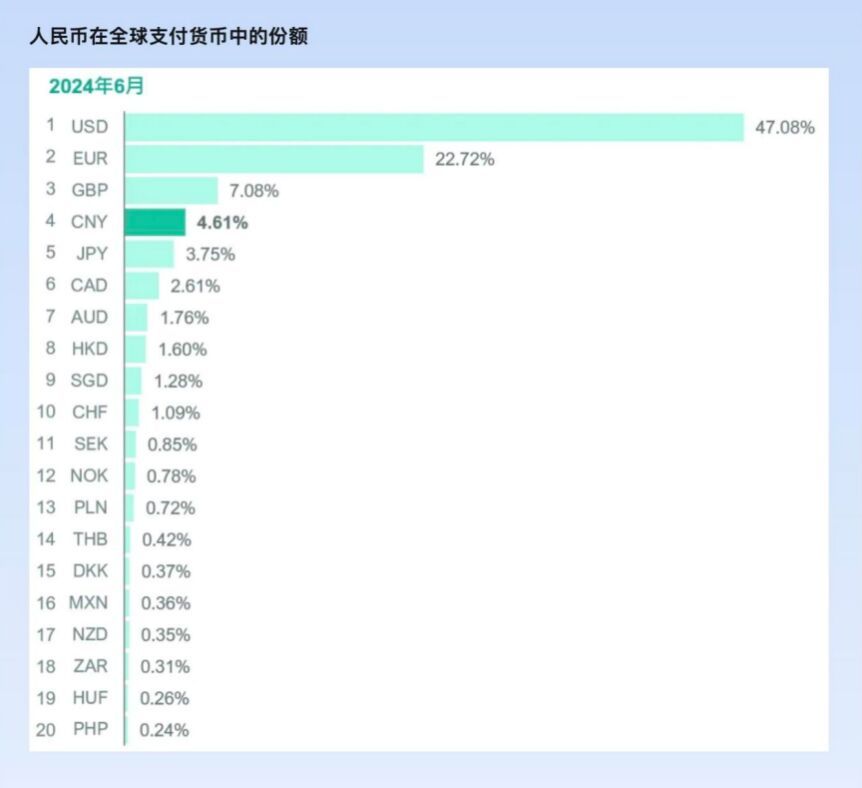 此外,与2022年11月相比,2024年6月人民币在全球支付中的份额几乎翻了一番,当时的占比仅为2.37%。