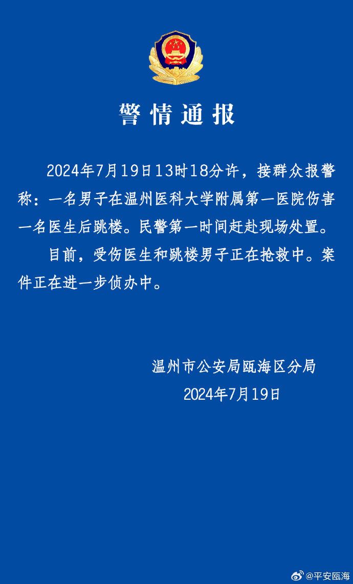 浙江省温州市公安局瓯海区分局通报,7月19日13时18分许,接群众报警称:一名男子在温州医科大学附属第一医院伤害一名医生后跳楼。民警第一时间赶赴现场处置。目前,受伤医生和跳楼男子正在抢救中。案件正在进一步侦办中。