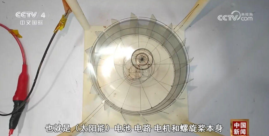 北京航空航天大学能源与动力工程学院博士彭谨哲介绍:“静电电机其实是像灯笼一样设计,这周边有一圈电极片,它是遵循了一个同性相斥、异性相吸的原则。相邻的两个电极片其实带有的电荷是完全相反的,所以在中间运动的电极片会被它右侧的电极片所排斥、被左侧的电极片吸引,最终形成一个升力,带动整个装置也就是太阳能电池、电路、电机和螺旋桨本身整个飞行器起飞。”