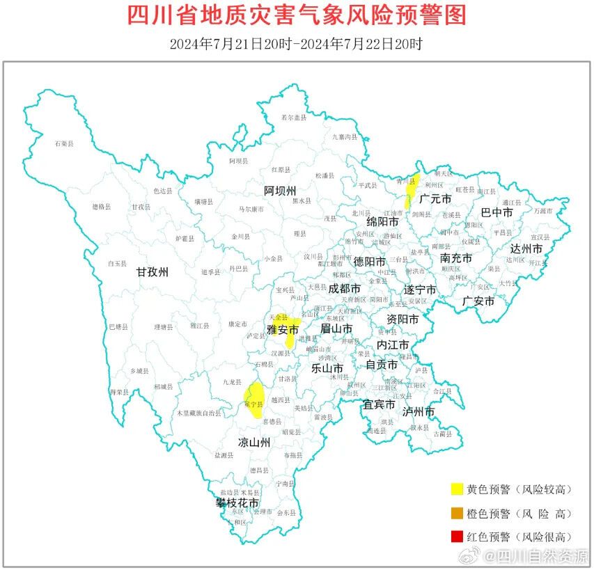 根据四川省气象台天气预报情况,结合四川省地质环境条件,7月21日20时至7月22日20时,全省地质灾害气象风险预警结果如下: