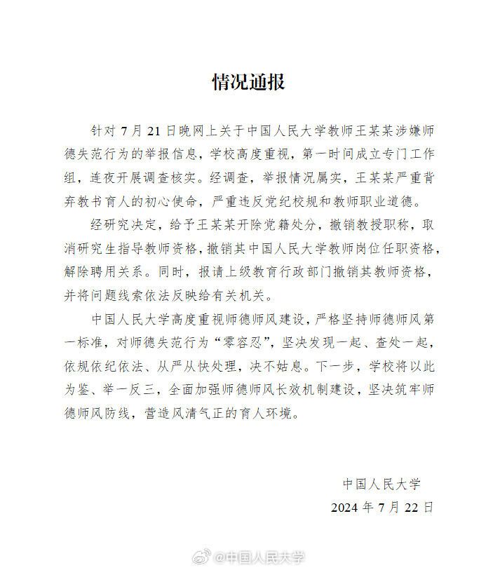 7月22日傍晚,中国人民大学通报“女博士举报教授性骚扰”:经调查,举报情况属实;给予王某某开除党籍处分,撤销教授职称,取消研究生指导教师资格,撤销其中国人民大学教师岗位任职资格,解除聘用关系。