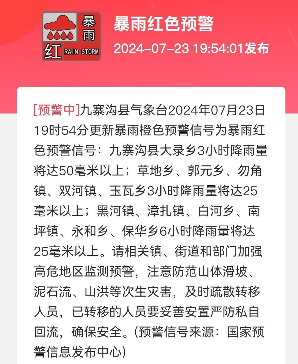 九寨沟县气象台2024年07月23日19时54分更新暴雨橙色预警信号为暴雨红色预警信号: