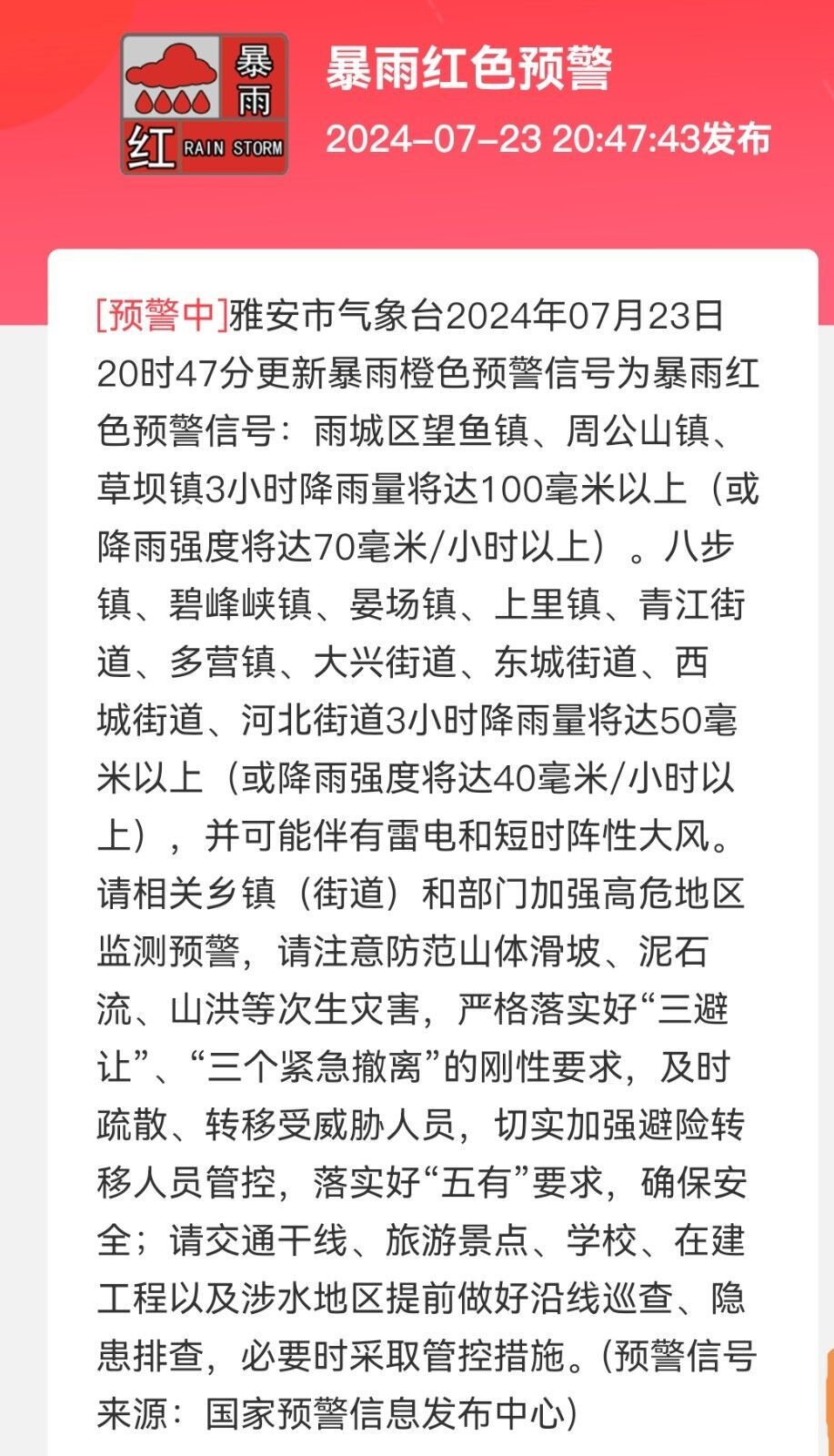 雨城区望鱼镇、周公山镇、草坝镇3小时降雨量将达100毫米以上(或降雨强度将达70毫米/小时以上)。八步镇、碧峰峡镇、晏场镇、上里镇、青江街道、多营镇、大兴街道、东城街道、西城街道、河北街道3小时降雨量将达50毫米以上(或降雨强度将达40毫米/小时以上),并可能伴有雷电和短时阵性大风。请相关乡镇(街道)和部门加强高危地区监测预警,请注意防范山体滑坡、泥石流、山洪等次生灾害,严格落实好“三避让”、“三个紧急撤离”的刚性要求,及时疏散、转移受威胁人员,切实加强避险转移人员管控,落实好“五有”要求,确保安全;请交通干线、旅游景点、学校、在建工程以及涉水地区提前做好沿线巡查、隐患排查,必要时采取管控措施。