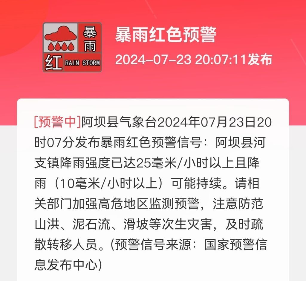 阿坝县气象台2024年07月23日20时07分发布暴雨红色预警信号: