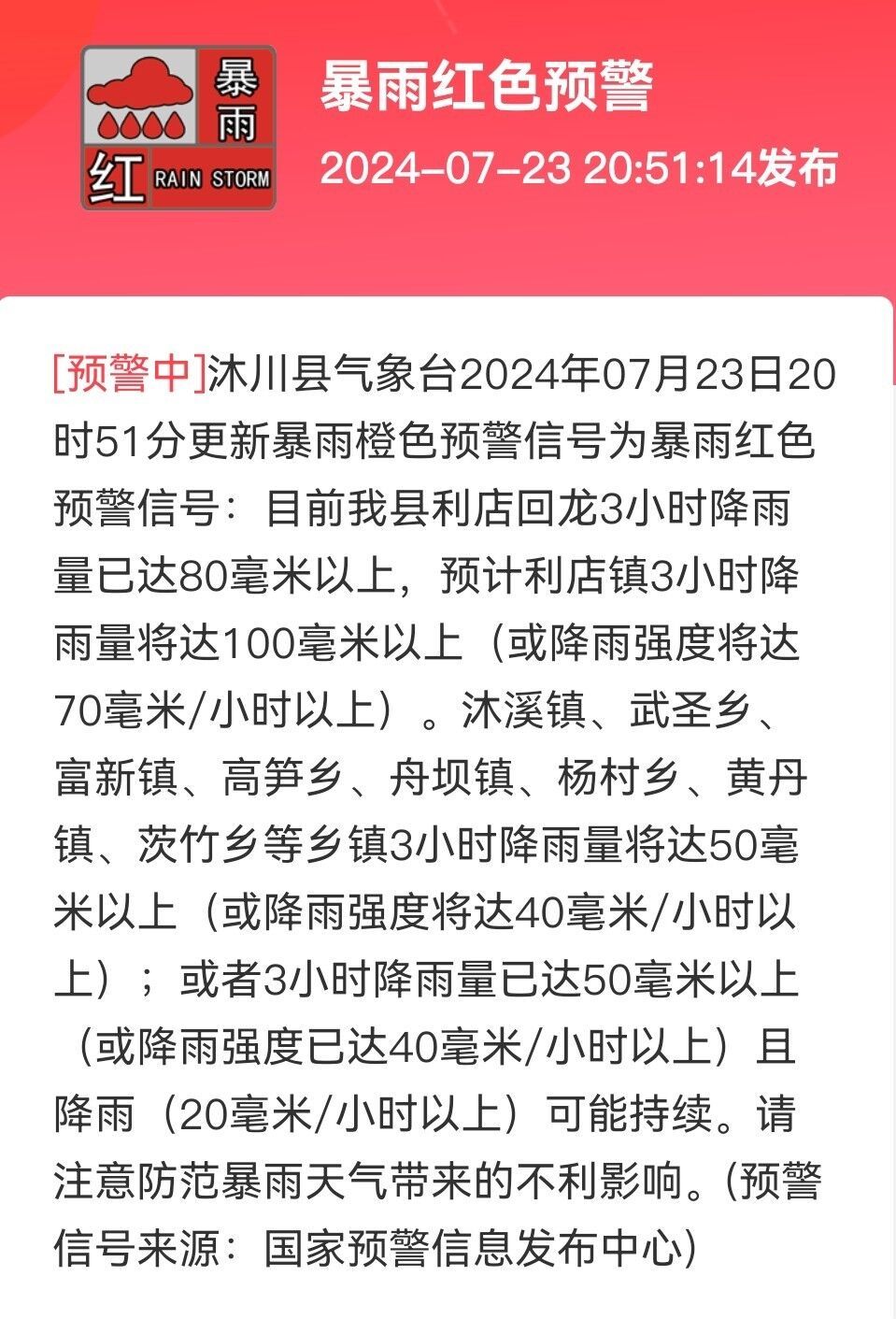 沐川县气象台2024年07月23日20时51分更新暴雨橙色预警信号为暴雨红色预警信号: