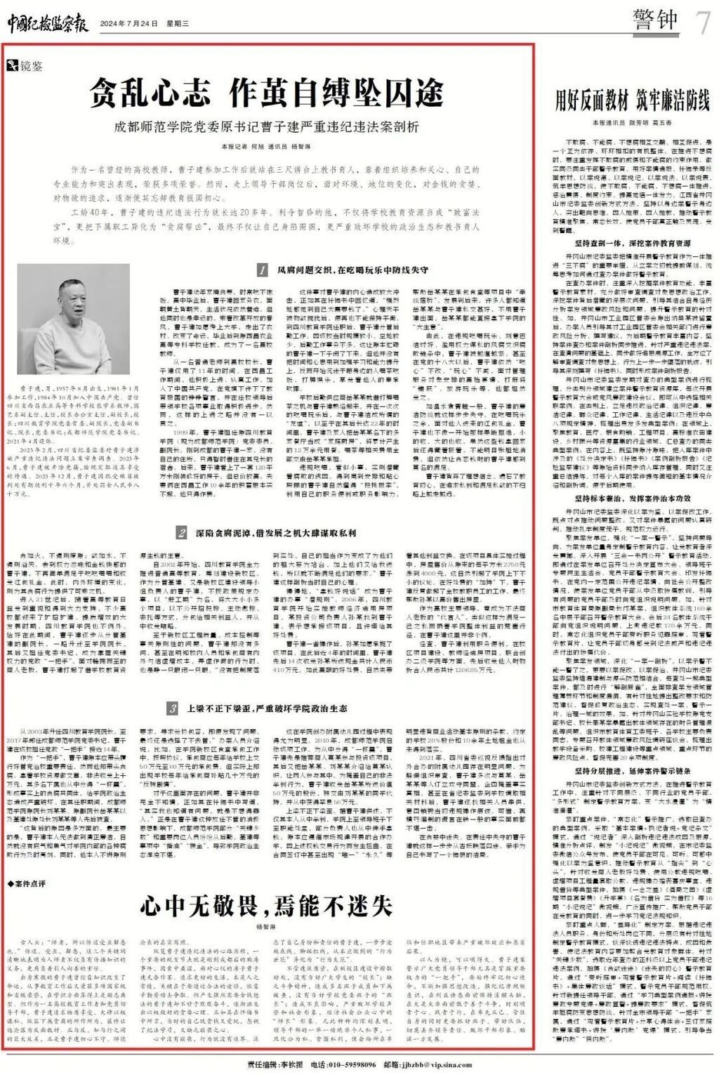 2024年7月24日,《中国纪检监察报》警钟版刊发《贪乱心志 作茧自缚坠囚途——成都师范学院党委原书记曹子建严重违纪违法案剖析》。