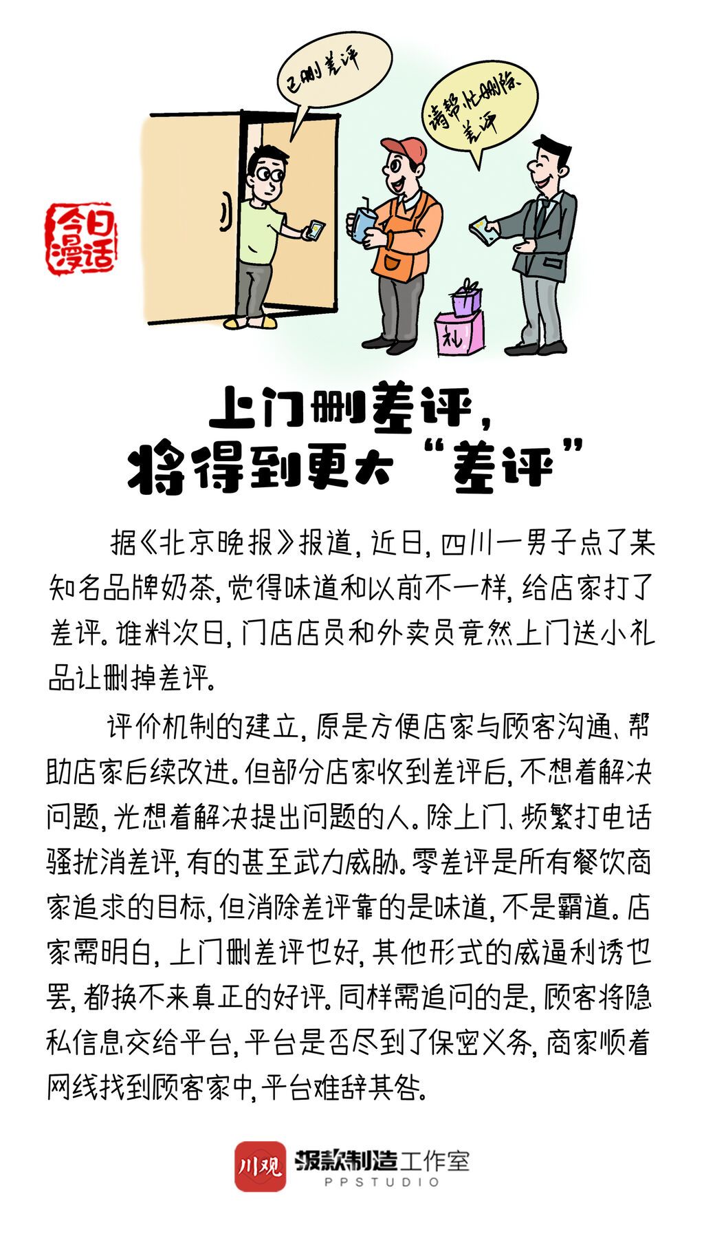 近日,四川一男子点了某知名品牌奶茶,觉得味道和以前不一样,给店家打了差评。谁料次日,门店店员和外卖员竟然上门送小礼品让删掉差评。如此删差评,你怎么看?