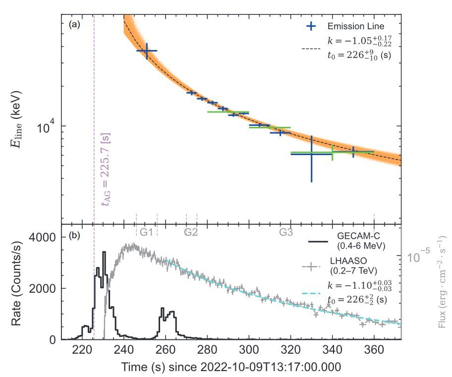此外,研究团队还发现谱线的相对展宽较窄(仅10%左右)且基本不随时间变化。令人更意外的是,在伽马暴主暴阶段谱线能量高达37兆电子伏特,这是迄今探测到的宇宙天体产生的最高能量的谱线。这些发现对于研究伽马暴及相对论性喷流的物理性质和产生机制具有重要而独特的价值,是伽马暴和极端宇宙观测研究的重大突破。