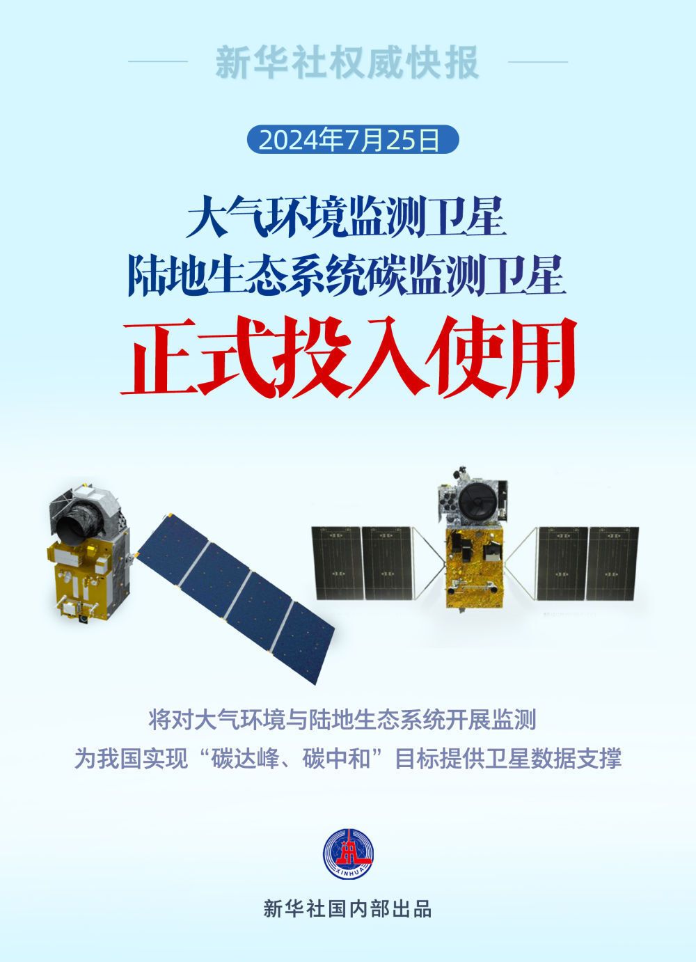 7月25日,国家航天局在京举办国家民用空间基础设施大气环境监测卫星、陆地生态系统碳监测卫星两颗科研卫星的投入使用仪式。