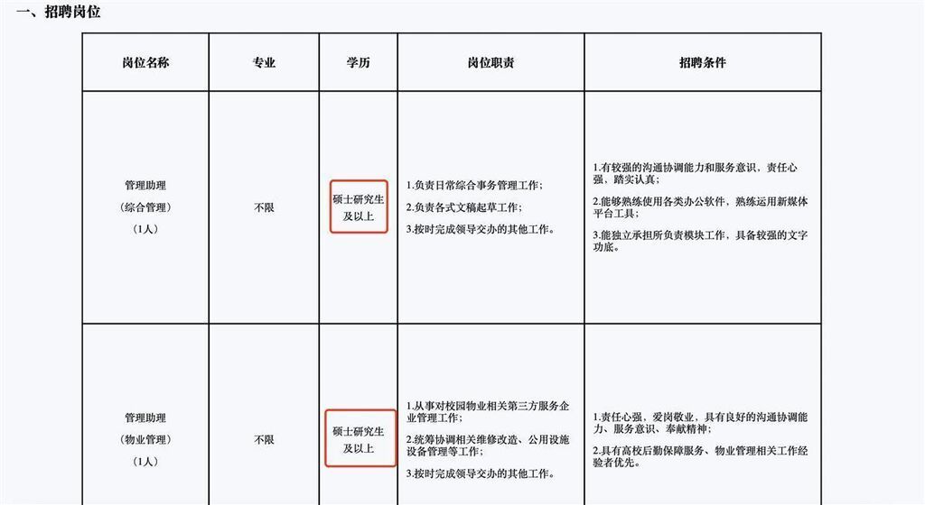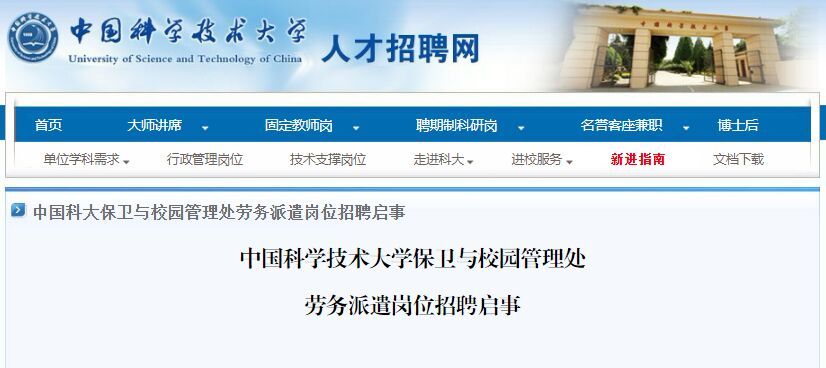 7月11日,中国科学技术大学(简称“中科大”)保卫与校园管理处发布一则劳务派遣岗位招聘信息,涉及四个管理助理岗位,其中包括综合管理、物业管理、消防管理、视频监控运维四个方向。四个岗位专业不限,学历均要求硕士研究生及以上。
