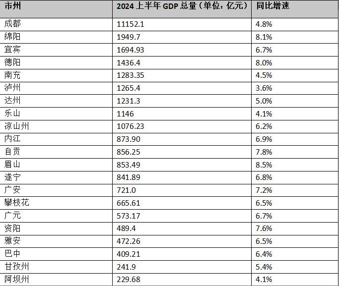 从增速来看,上半年,四川GDP增速(5.4%)跑赢全国GDP增速(5.0%),高出0.4个百分点,而全省又有14个市州GDP增速跑赢全省平均增速,甘孜GDP增速与全省持平,另有6个市州同比增速低于全省平均增速。