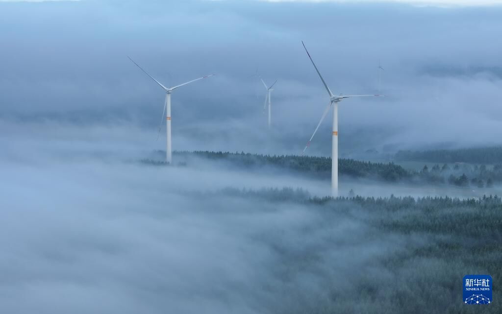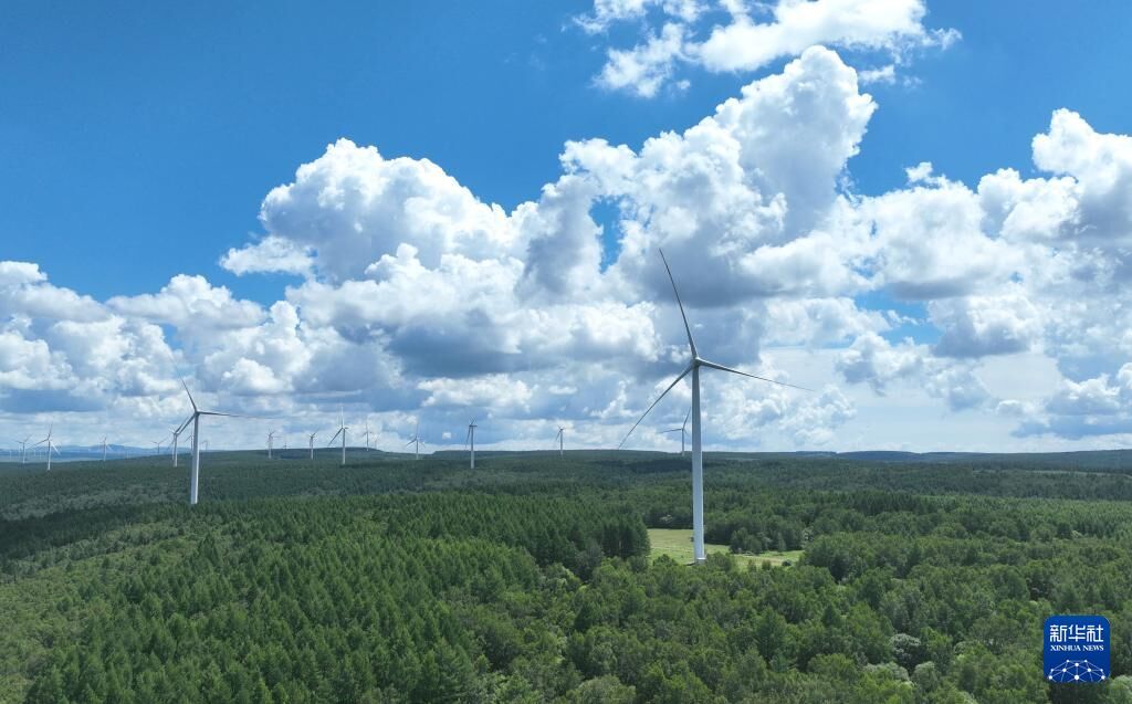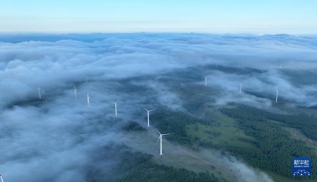 7月25日拍摄的河北省围场满族蒙古族自治县御道口镇附近的风电场景色(无人机照片)。