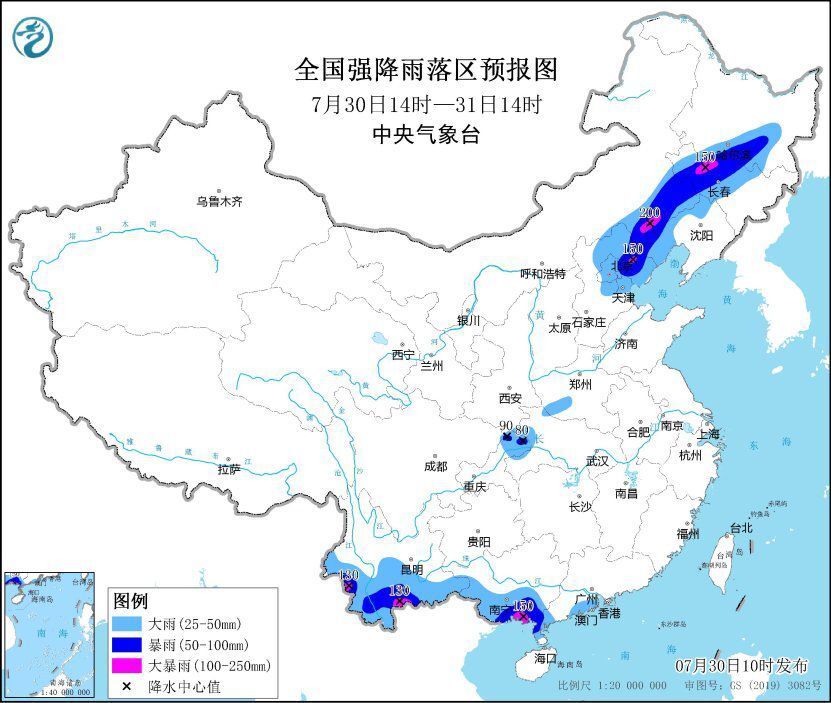 预计,7月30日14时至31日14时,河北中北部、北京、天津、内蒙古东南部、辽宁西部、吉林中西部、黑龙江南部、重庆北部、云南中南部、广西南部、广东南部等地部分地区有大到暴雨,其中,河北东北部、内蒙古东南部、辽宁西南部、吉林西部、云南南部、广西南部沿海等地部分地区有大暴雨(100~200毫米)。上述部分地区伴有短时强降水(最大小时降雨量20~50毫米,局地可超过80毫米),局地有雷暴大风等强对流天气。