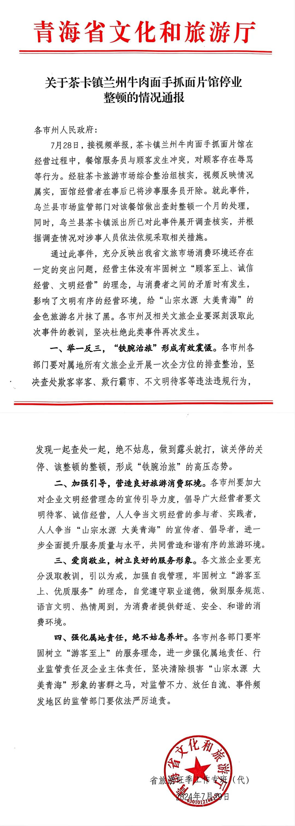 ·青海官方通报“面馆服务员辱骂顾客”:涉事餐馆查封整顿一个月。