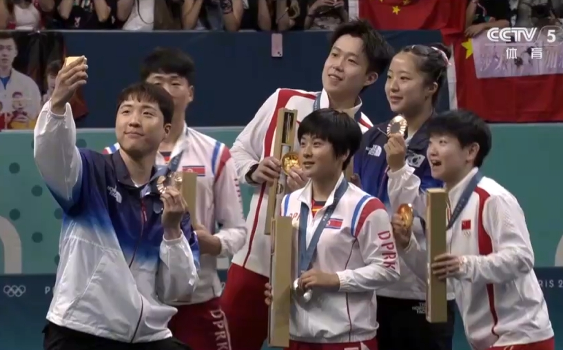 北京时间7月30日晚,在巴黎奥运会乒乓球混合双打决赛中,中国组合王楚钦/孙颖莎4-2战胜朝鲜组合,夺得金牌。朝鲜队摘银,韩国队摘铜。赛后,中朝韩运动员自拍留念,这一幕,好暖!