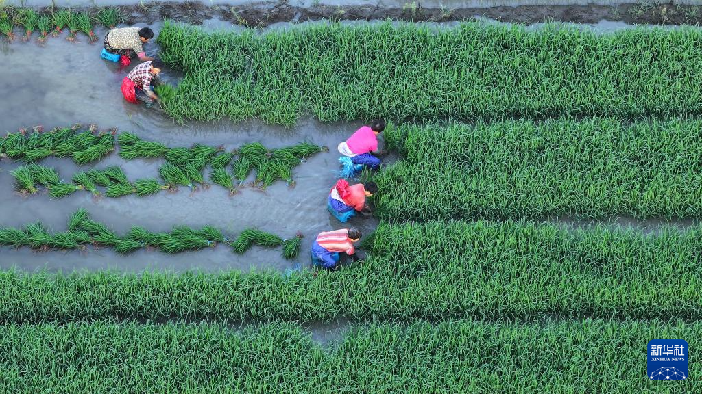 7月30日,在浙江省台州市路桥区横街镇田间,农民们忙着拔秧苗备插秧(无人机照片)。