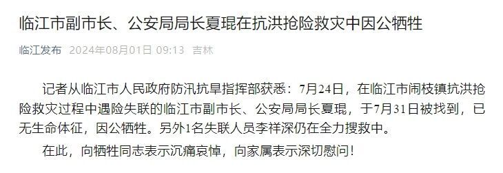 据临江发布微信公众号消息,记者从临江市人民政府防汛抗旱指挥部获悉:7月24日,在临江市闹枝镇抗洪抢险救灾过程中遇险失联的临江市副市长、公安局局长夏琨,于7月31日被找到,已无生命体征,因公牺牲。另外1名失联人员李祥深仍在全力搜救中。
