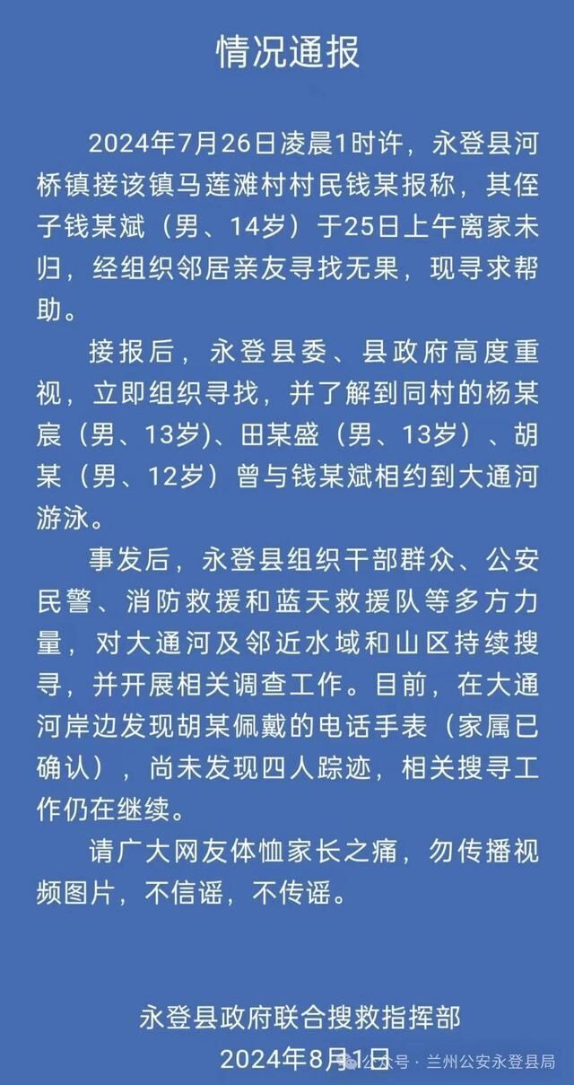 ·甘肃4名男孩相约游泳失联,兰州永登县:发现电话手表,仍在搜寻。