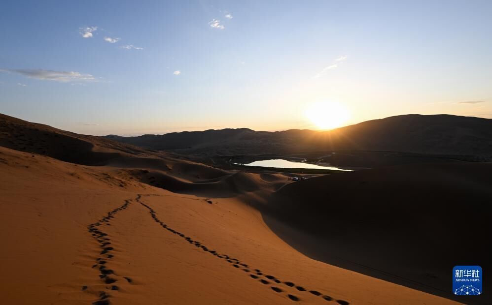 夏日,位于内蒙古阿拉善盟阿拉善右旗的巴丹吉林沙漠—沙山湖泊群沙海莽莽、水天相映,景色壮美。
