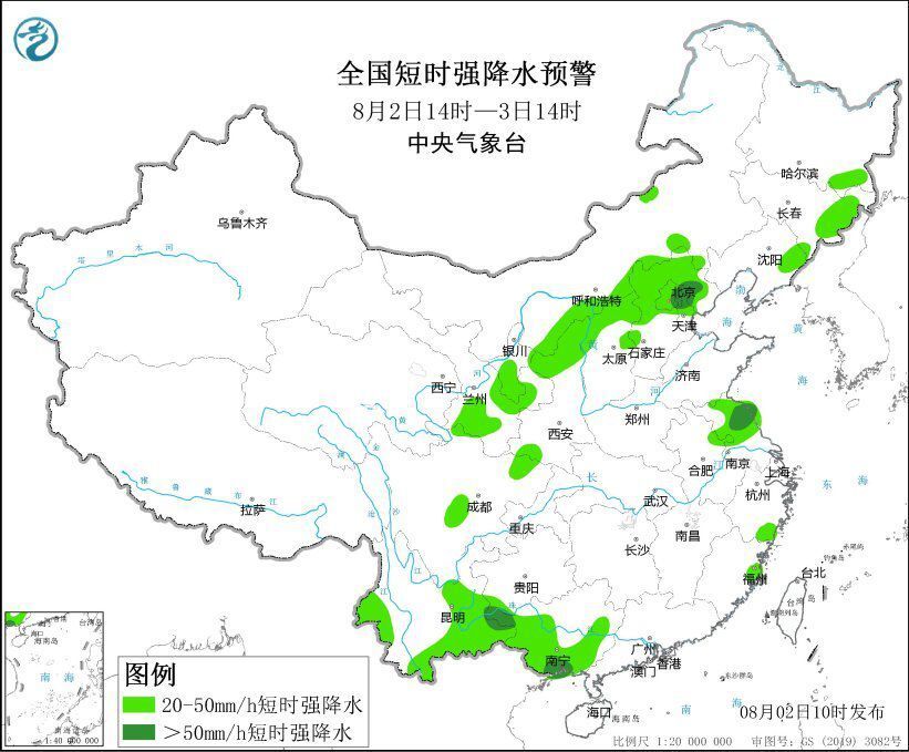 预计8月2日14时至3日14时,西北地区东部、华北中北部、东北地区东部、黄淮东部、西南地区南部、华南西部等地的部分地区将有小时雨量大于20毫米的短时强降水天气,其中,北京东部、河北东北部、天津北部、江苏中北部、广西西部和南部沿海等地局地小时雨量大于50毫米,最大可达70毫米以上;西北地区东部、华北北部、黄淮东部等地的部分地区将有8-10级雷暴大风或冰雹天气。