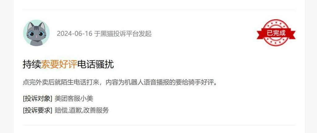 记者在“黑猫投诉”消费者服务平台发现,含“索要好评”的投诉达557条,不乏对“AI骚扰电话”的投诉。其中,有一名消费者投诉美团,“点完外卖就有陌生电话打来,内容为机器人语音播报的要给骑手好评。”