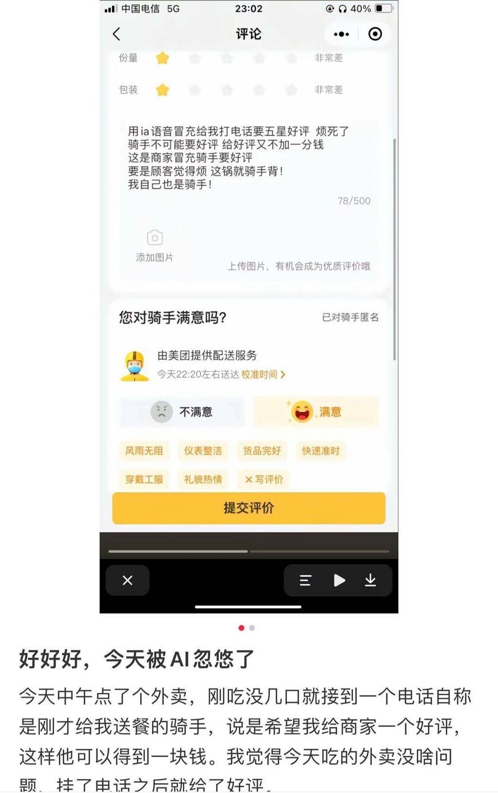 有类似遭遇的不止张芳,有人还将自己与“AI外卖小哥”的对话上传到社交平台,不少网友跟帖称也被同样方式索要过好评。“外卖要好评都请AI演员了,还有什么是真的?”