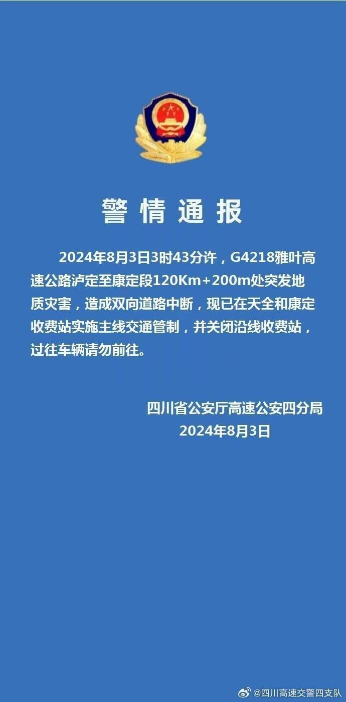 2024年8月3日3时43分许,G4218雅叶高速公路泸定至康定段120Km+200m处突发地质灾害,造成双向道路中断,现已在天全和康定收费站实施主线交通管制,并关闭沿线收费站。过往车辆请勿前往。