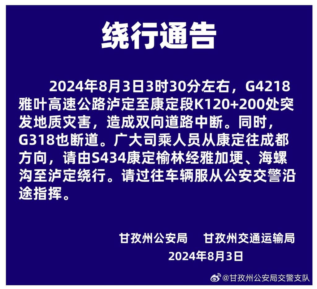 记者从甘孜州公安局交警支队获悉,2024年8月3日3时30分左右,G4218雅叶高速公路泸定至康定段K120+200处突发地质灾害,造成双向道路中断。同时,G318也断道。广大司乘人员从康定往成都方向,请由S434康定榆林经雅加埂、海螺沟至泸定绕行。请过往车辆服从公安交警沿途指挥。