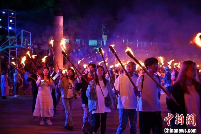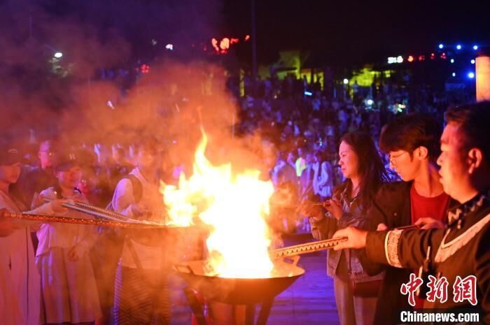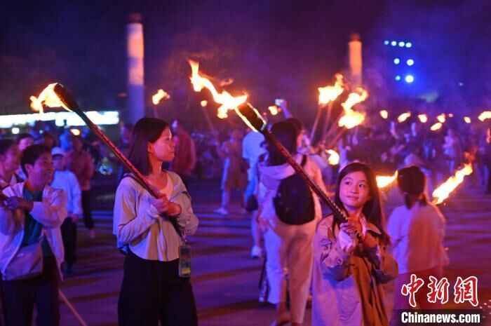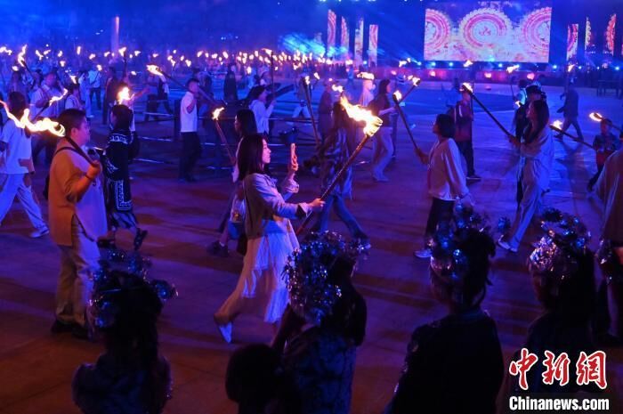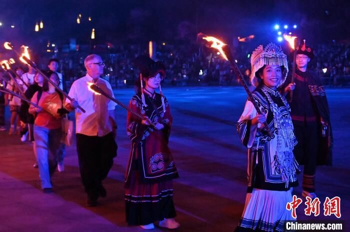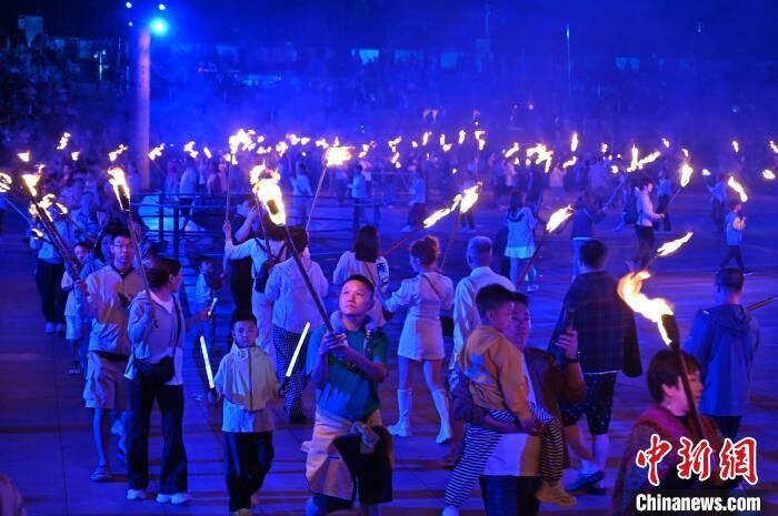 8月2日晚,贵州六盘水海坪彝族风情小镇火把广场的火把节活动吸引游客参加。2024年海坪彝族火把季于7月13日开幕,活动持续至8月11日。本次活动围绕取火、送火的火把节传统文化核心,展现彝族文化的魅力,吸引游客参加。中新社记者 陈楚红 摄