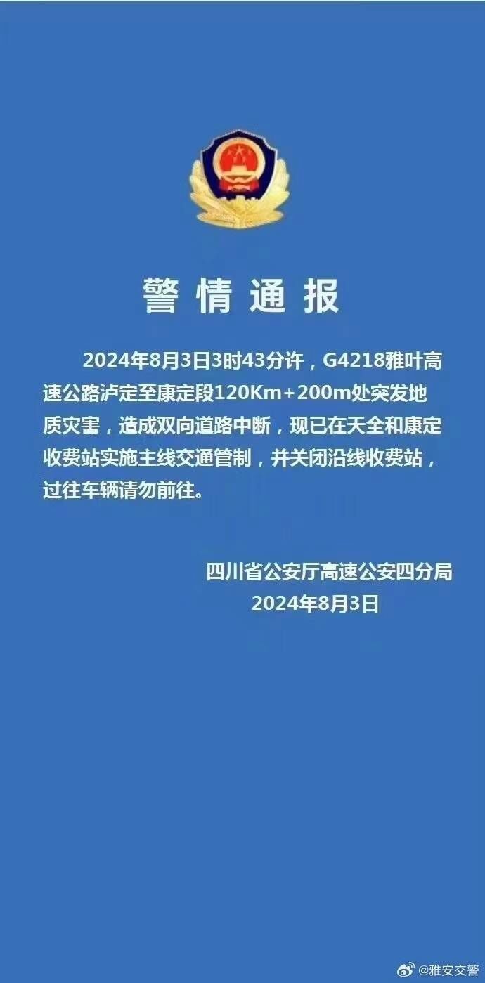 提醒!因突发地质灾害,天全、康定收费站实施主线交通管制