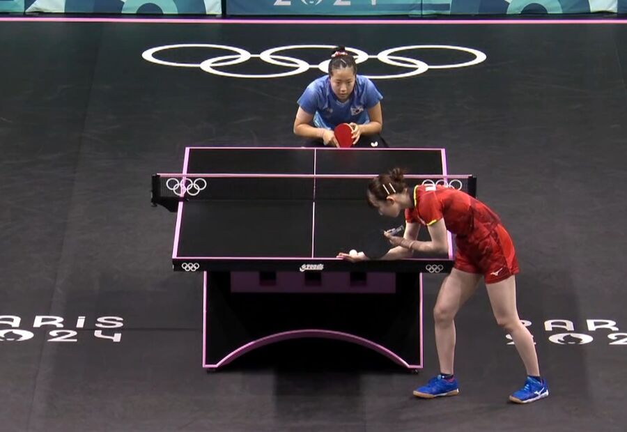 第一局申裕斌不断打早田希娜左手的位置,她知道早田希娜的弱点,早田还没热开首局一退再退很快以9-11吞下失利。