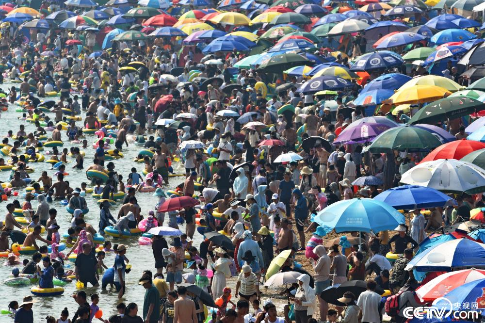 高温持续,大连海滨浴场游客爆满。