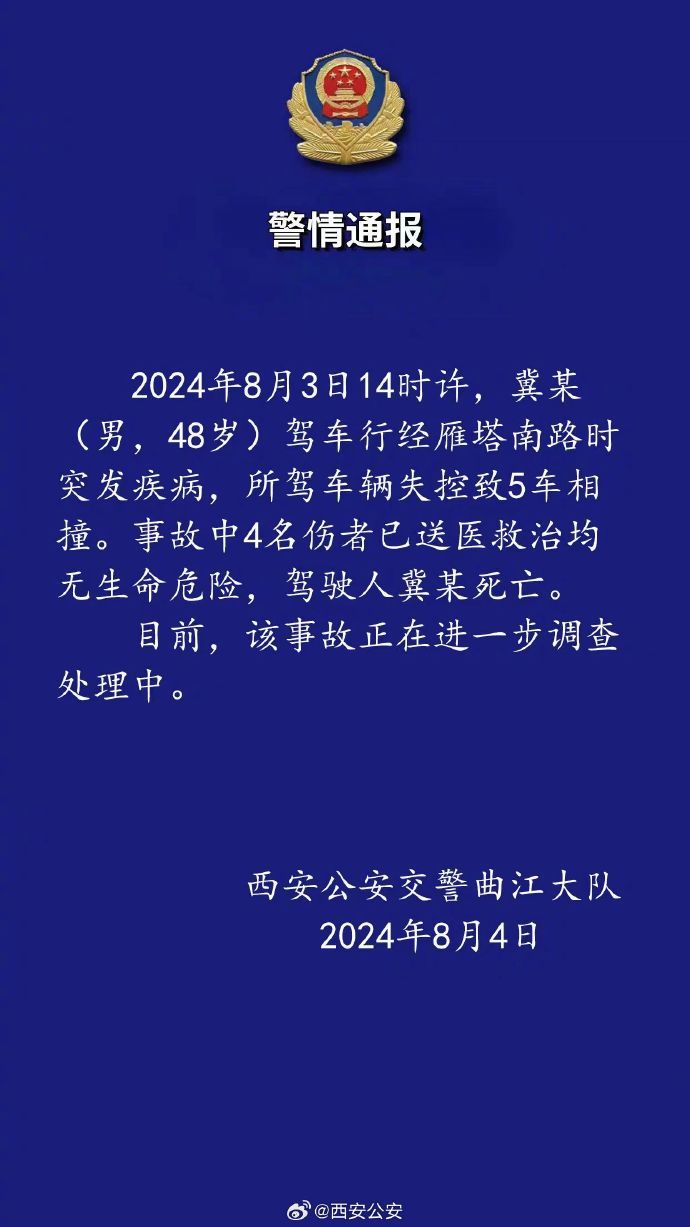 ·西安交警通报“一车辆失控致5车相撞1死4伤”:驾驶员突发疾病。